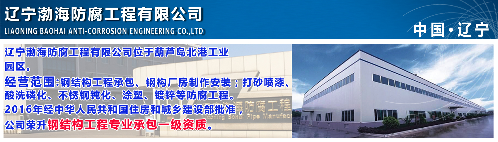 遼寧渤海防腐工程有限公司是一家集各種大型橋梁、鋼結(jié)構(gòu)工程制作、橋式、門式起重機(jī)制造、船體分段制作、礦山設(shè)備制造、環(huán)保設(shè)備研發(fā)制造、大型金屬涂塑、防腐處理等多元化機(jī)械裝備制造公司,2013-2016年公司連獲《國家高新技術(shù)企業(yè)》稱號。 Liaoning Bohai Anti-corrosion Engineering Co., Ltd. is a collection of large-scale bridges, steel structure engineering, bridge, gantry crane manufacturing, hull segment production, mining equipment manufacturing, environmental equipment R & D and manufacturing, large metal coating, anti-corrosion treatment, etc. Chemical machinery equipment manufacturing company, the company won the title of "National High-tech Enterprise" in 2013-2016. 公司2017年榮升鋼結(jié)構(gòu)工程專業(yè)承包壹級資質(zhì),可承攬各類大型鋼結(jié)構(gòu)及網(wǎng)架工程制作、加工、安裝;同時具有橋式起重機(jī)(C)制造、改造、安裝、維修資質(zhì);公司可承接各類金屬表面防腐處理工程業(yè)務(wù)(酸洗、磷化、打砂、涂塑)。